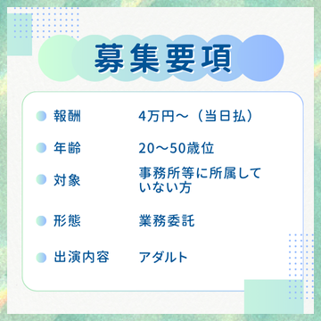 応募受付~撮影すべて担当カメラマン1名で対応しますので緊張する必要はありません。まだAVに出演したことない女性も気軽にお仕事でき当日で即金収入を稼げます。撮影前にご確認いただき、撮影後すぐに現金でお渡しいたします。面倒な手続きなどはございません。